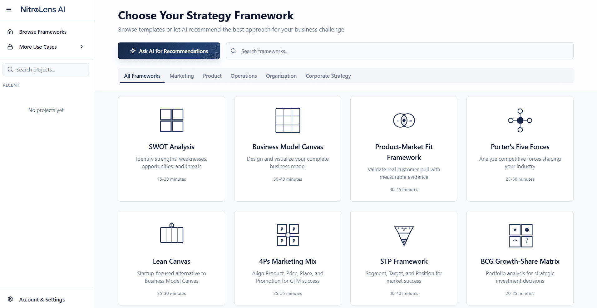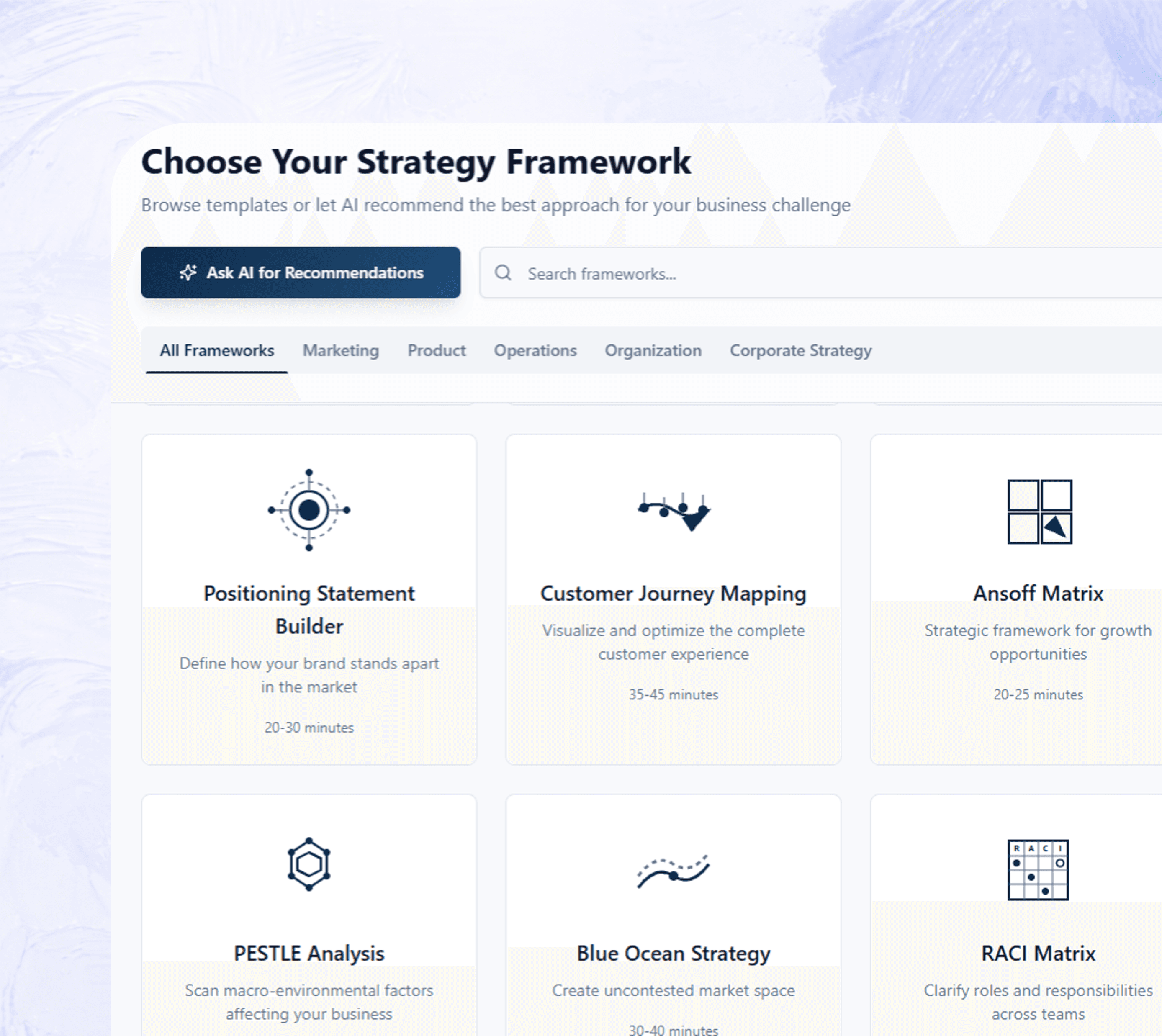 Curated library of reputable frameworks, designed by experienced experts. Each framework comes with built-in agentic guidance so users can apply it with confidence, not guesswork
