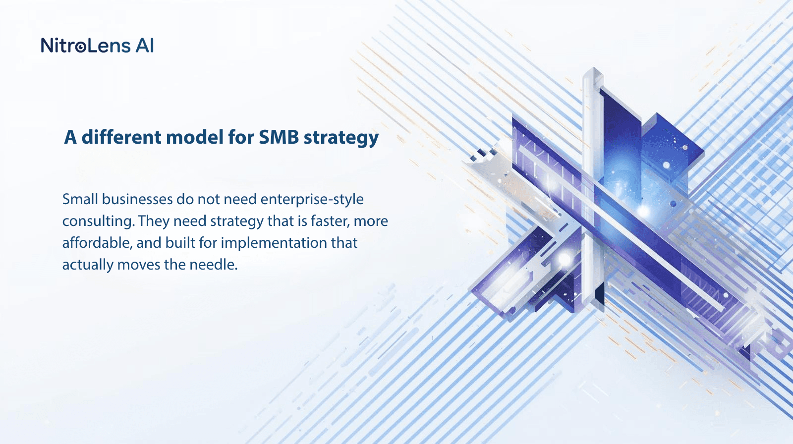 Instead of months-long consulting engagements and massive slide decks, we combine AI-powered strategic analysis with hands-on support to help SMB teams actually implement the strategy.